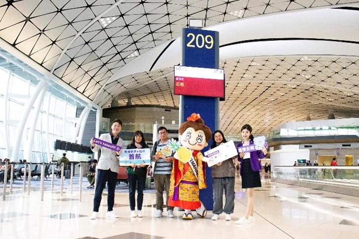 HK Express management celebrates Ishigaki route resumption with passengers at Hong Kong International Airport, distributing commemorative gifts.
